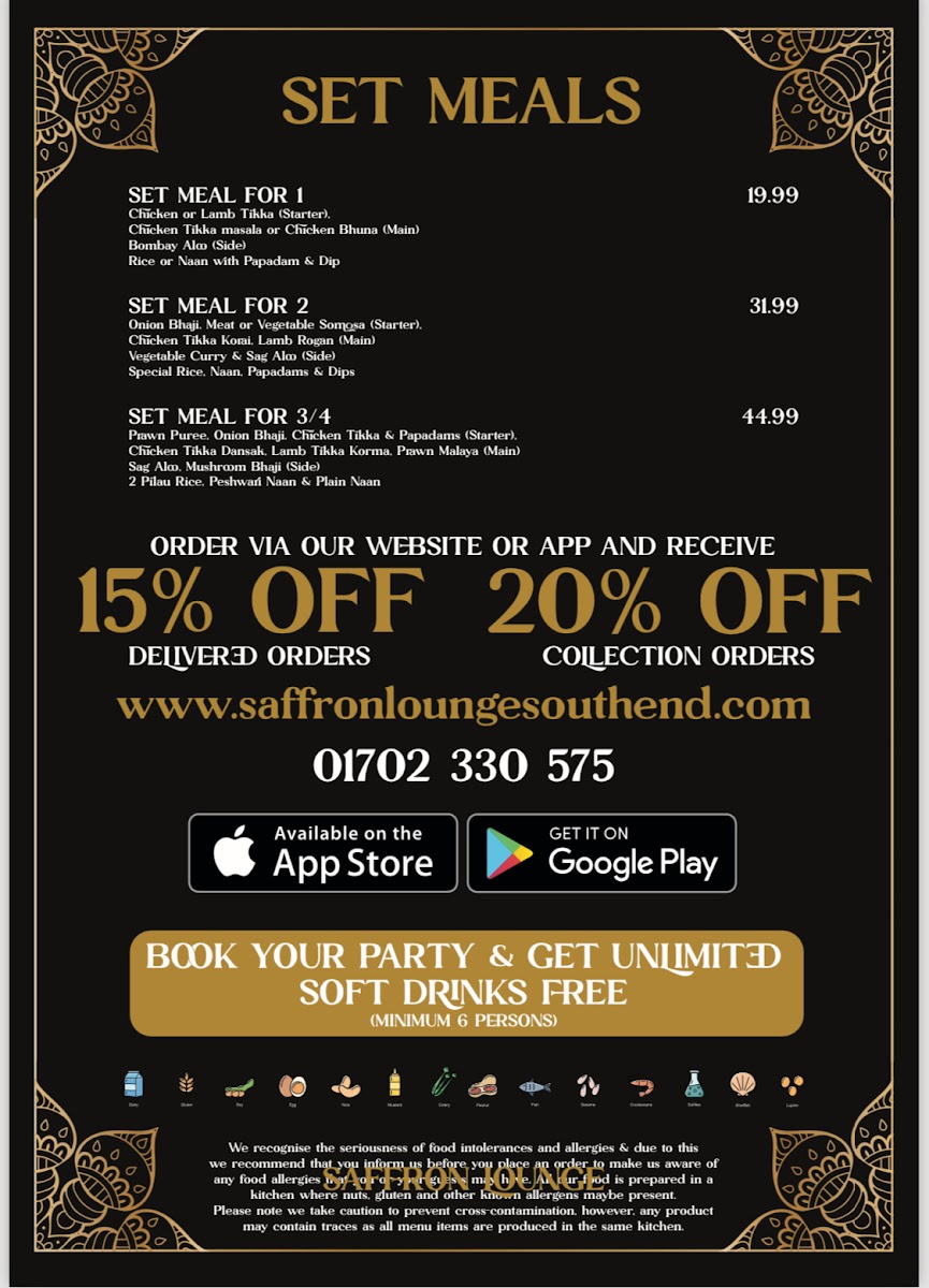 Welcome to Saffron Lounge, a culinary gem nestled in Westcliff-on-Sea. Known for its vibrant dishes, the menu offers an exquisite range that leaves a lasting impression. Those in search of authentic Indian cuisine will find a delightful selection of Tandoori Specialties, such as the succulent Chicken or Jamb Tikka and flavorful Tandoori King Prawn, all priced reasonably from £10.95 to £16.95.